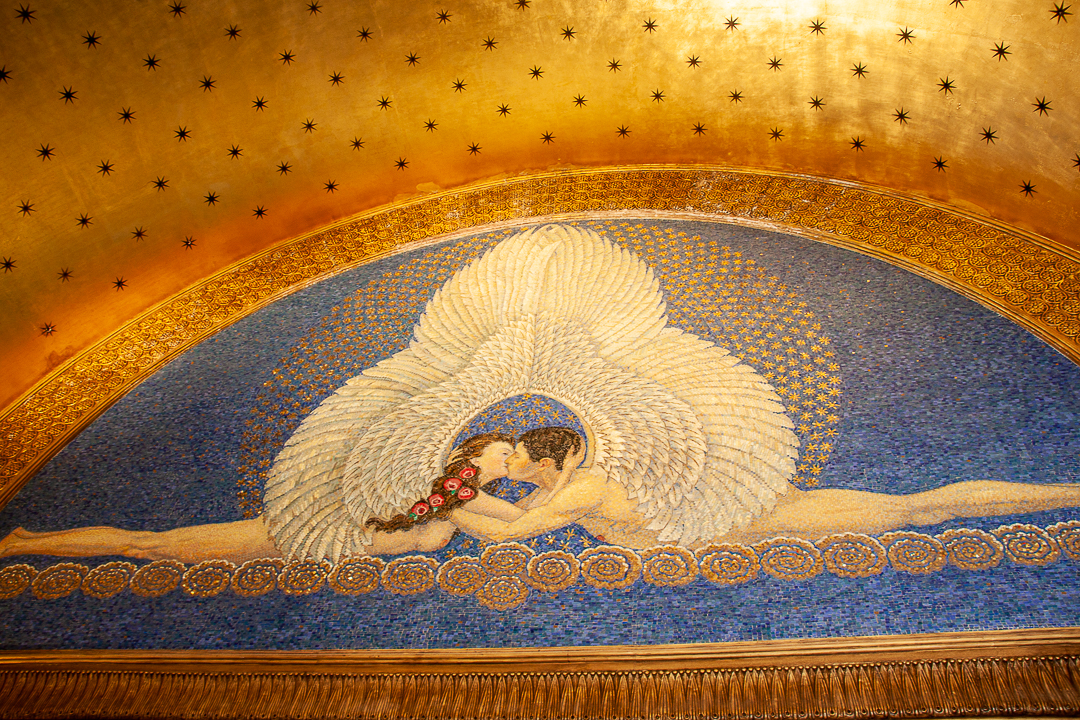 Innen befinden sich zwei leuchtende Wandmosaiken. „Der Kuss“ oder „Die Treue“ und „Fortuna“, die Glücksgöttin. Im Fürstenzimmer, das sich auf einer der höheren Ebenen befindet, kann man sich trauen lassen. Da passen diese beiden glücksbringenden Motive ja ganz gut. Außerdem gibt es noch eine Aussichtsplattform, die sich wahrscheinlich auch lohnt, denn der Turm ist fast 50 Meter hoch.