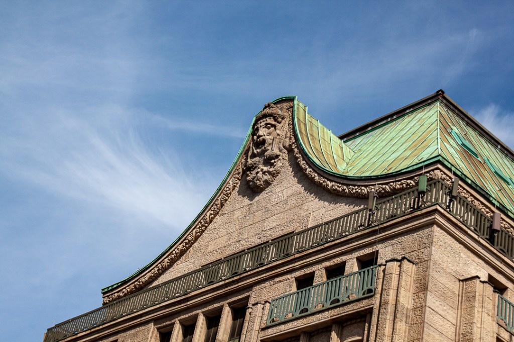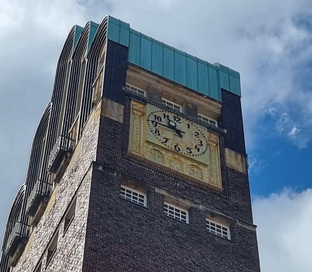 Dabei entdecke ich die um die Ecke geführten Fensterbänder. Sie waren für die Zeit, als der Turm errichtet wurde, zwischen 1905-1908, etwas komplett Neuartiges und verweisen schon auf den nachfolgenden Expressionismus. (Das Chilehaus in Hamburg ist ein typisches Beispiel für den (Backstein)expressionismus, der nach dem Ersten Weltkrieg aufkam und bis in die Zwanziger Jahre des vergangenen Jahrhunderts auftrat.)