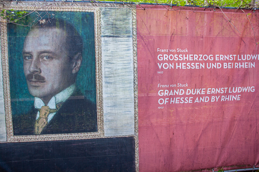 Wir gehen einmal um den Hochzeitsturm herum. Auf den Abdeckplanen der Baustelle ist ein Foto von Großherzog Ernst Ludwig (1898-1937) zu sehen. Er hat das hier alles gegründet. Eigentlich sieht er ganz sympathisch aus mit seinen sanften Augen.