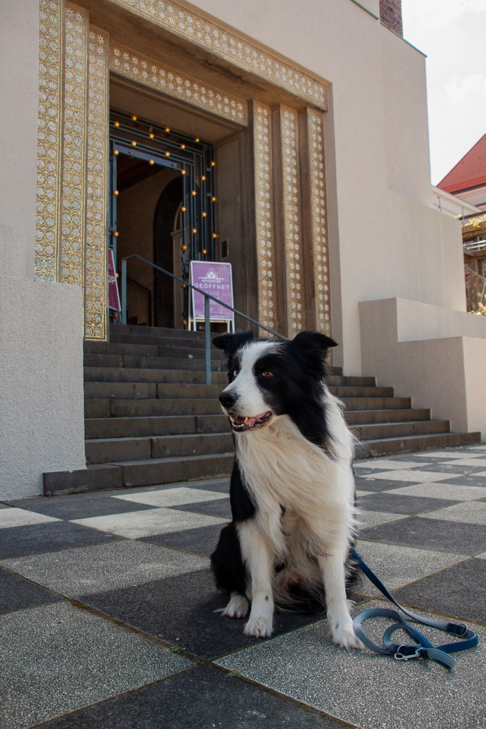 Beim Gartenpavillon von Albin Müller (Fertigstellung 1914), kommt uns plötzlich eine Rentnergruppe entgegen. Sie scheinen alle sehr aufgedreht sein, jedenfalls stürzen sie sich frech die Treppe hoch, ohne Platz für uns und unseren Hund zu lassen. Doch jeglicher Unmut ist plötzlich vergessen, als ich das Portal des Ernst-Ludwig-Hauses erblicke.