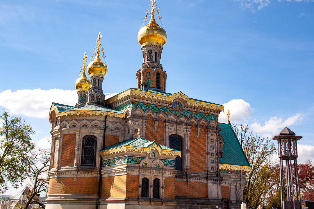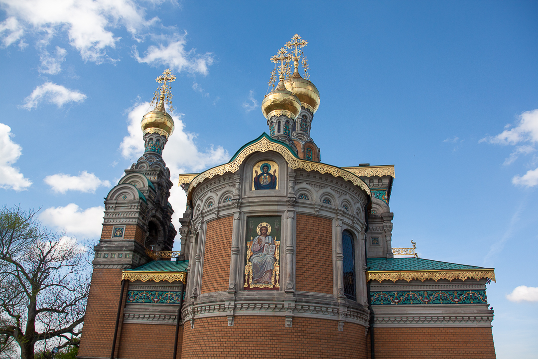 Die Russische Kapelle wurde übrigens auch schon zwischen 1897 und 1899 erbaut und zwar deshalb, weil die Schwester von Großherzog Ernst Ludwig, Alix von Hessen-Darmstadt, Zar Nikolaus II. von Russland geheiratet hatte. Dieser wollte bei den Besuchen in der Heimat seiner Frau nicht auf ein eigenes Gotteshaus für seine Familie und seinen Hofstaat verzichten. Etwas skurril, oder? Nur deshalb steht hier die Kapelle…“ Ich mache eine Pause und beobachte die Wirkung meines ach so fachkundigen Geschichtsvortrags auf den Historiker-Hubby. Scheinbar hat er nichts einzuwenden.