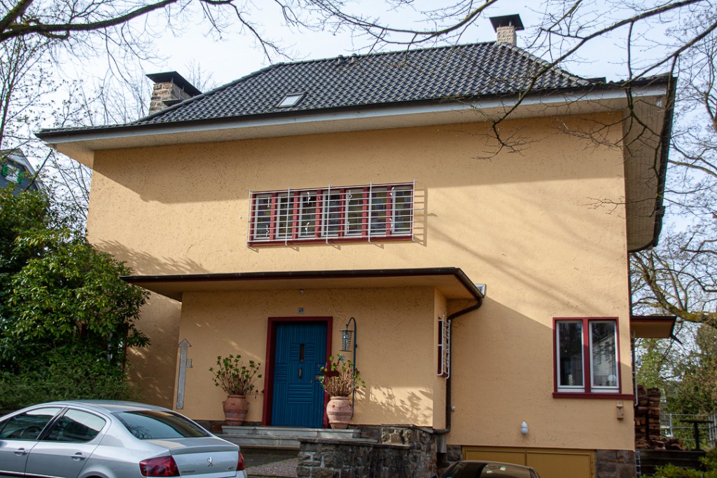 2. Haus Mook an der Freyastraße als „typisches Beispiel für großbürgerliches Wohnen in der Zeit zwischen dem Ersten und dem Zweiten Weltkrieg. Es wurde nach Entwürfen des Architekten Friedrich Siepermann (1891 – 1971 ) errichtet. Seine Bauten (…) weisen neben regionalen Einflüssen, die sich häufig an der Verwendung ortsüblicher Materialien festmachen lassen, auch zeittypische, damals hochmoderne Elemente auf.“ (Beschreibung in der Denkmalliste der Stadt Wuppertal) Hier also ein Haus mit Elementen des „Neuen Bauens/der Neuen Sachlichkeit“, ziemlich schlicht und von der Grundform her symmetrisch gehalten.