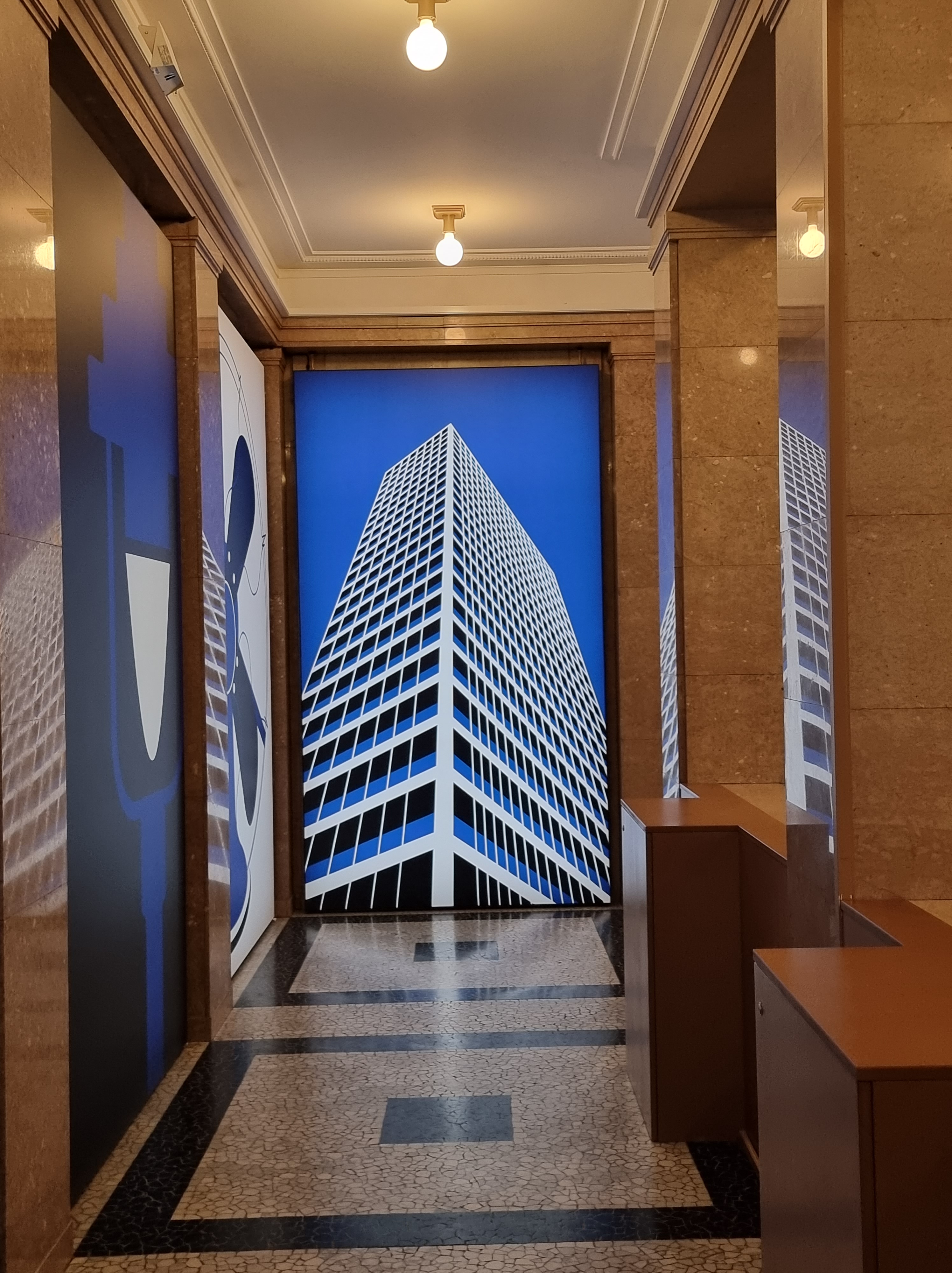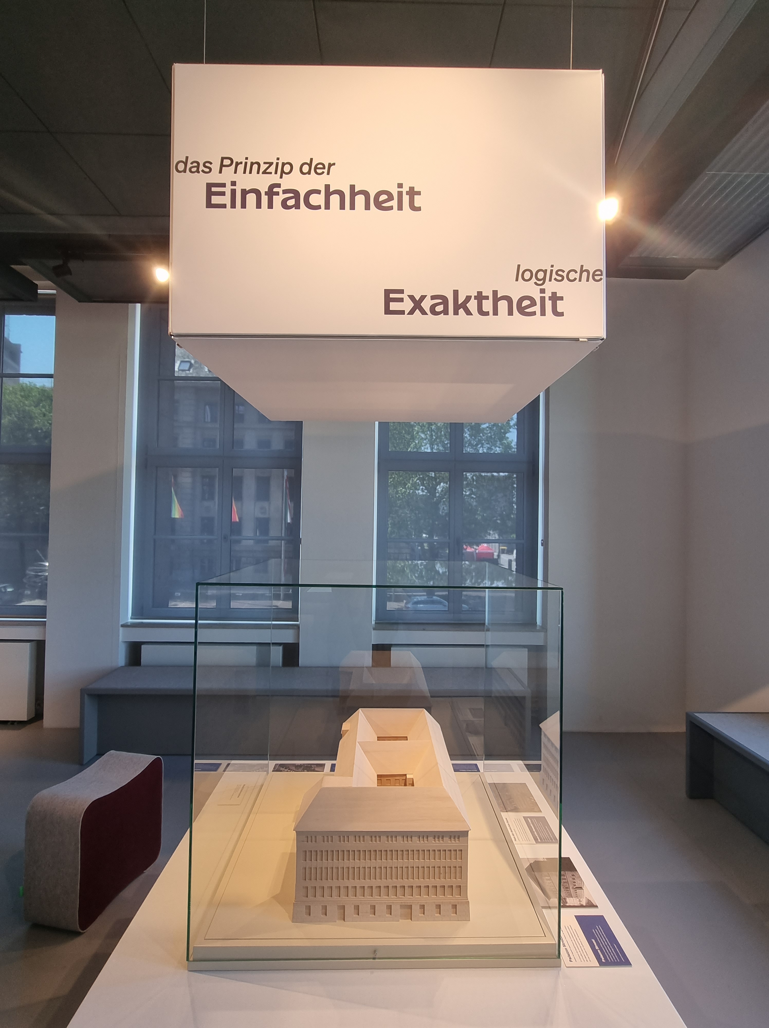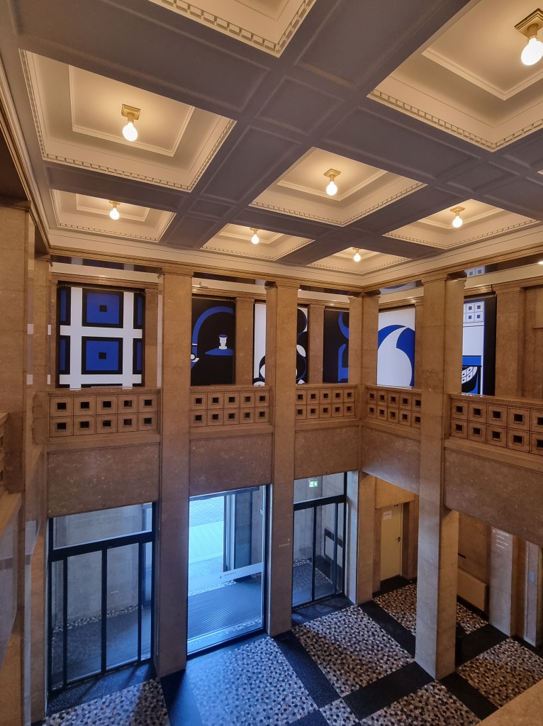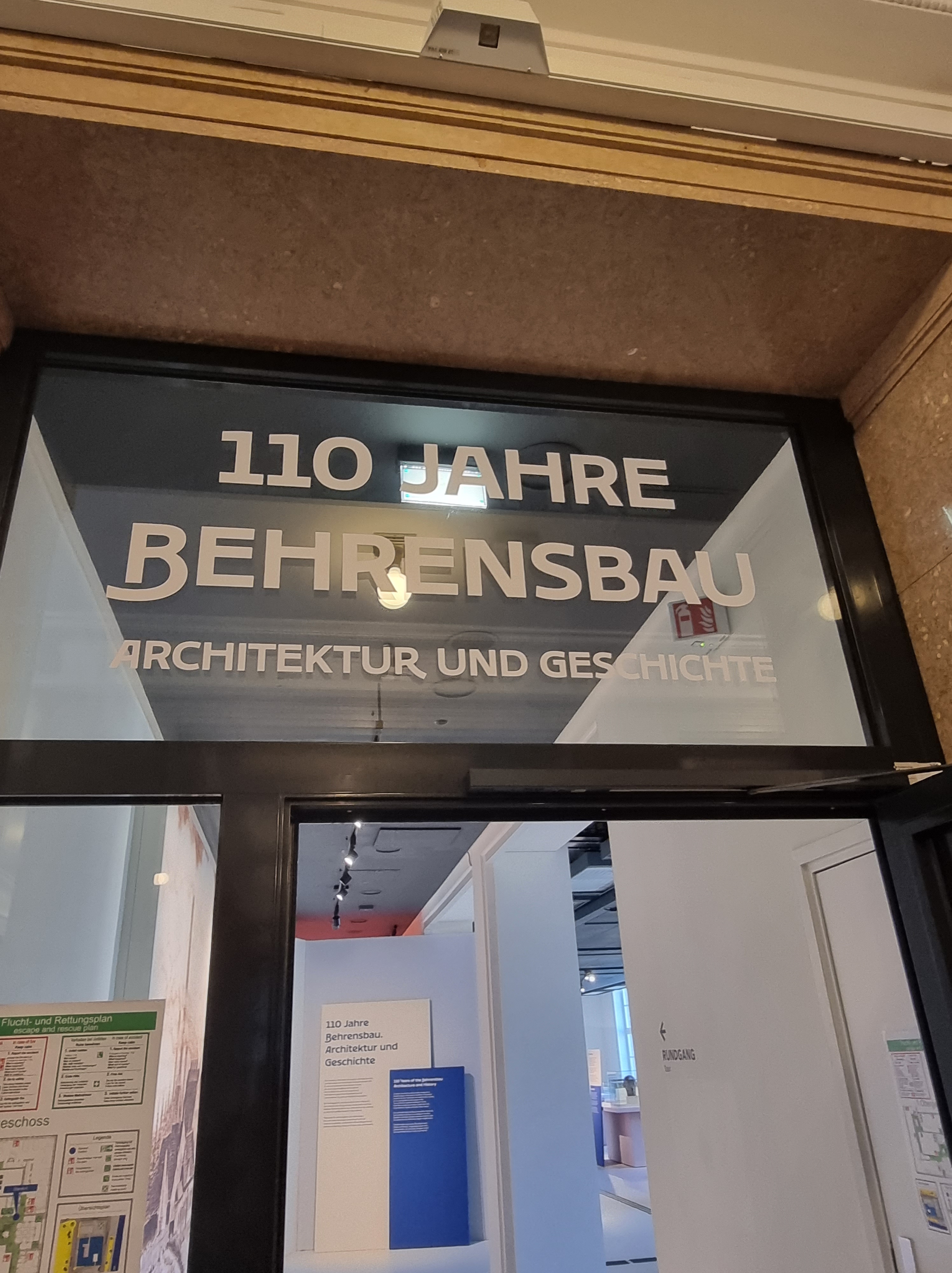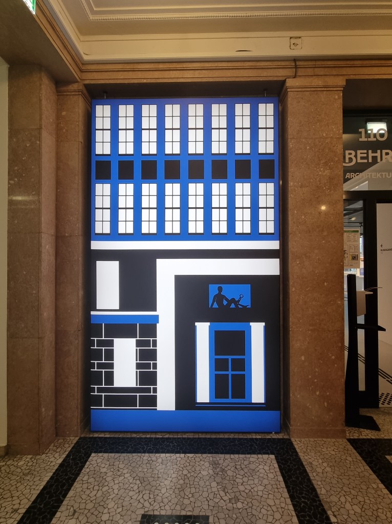 Wie hier auf den Fotos gut zu sehen ist, lohnt sich der Besuch der Ausstellung schon allein des Gebäudes wegen. 😀 Selbst wenn man keine Zeit für die Ausstellung hat, sollte man mal in den Behrensbau am Rheinufer gehen, denn es kostet keinen Eintritt und man bekommt einen Hauch „Rockefeller-Center-Flair“oder „Empire-State-Building-Atmosphäre“ geboten. Zumindest auf den ersten Blick rufen die wunderschöne Eingangshalle und die geometrischen Illustrationen ein ähnliches Gefühl hervor wie die Top-Locations in New York. 😉 Außerdem bekommt man in der ersten Etage sehr gut einen Eindruck davon, was die schlichten Entwürfe Peter Behrens‘ eigentlich für das Raumgefühl bedeuten. Die vielen Fenster, die Klarheit der geometrischen Strukturen… kann man sich angesichts einer so hellen und geordneten Atmosphäre nicht gleich viel besser konzentrieren?