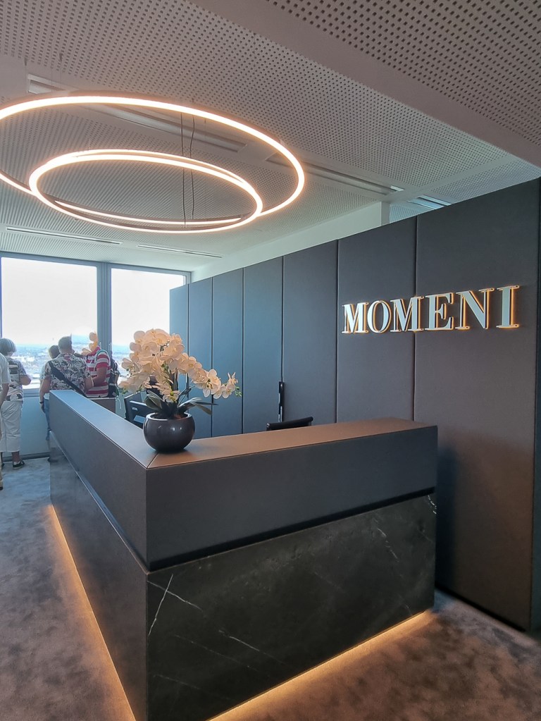 Wir werden mit dem Aufzug hochgefahren und wie das immer so ist in Hochhäusern, ist der Blick nach draußen unfassbar spektakulär. Alle, die bei der Führung teilnehmen, rufen beeindruckt „Ah“ und „Oh“ beim Ausblick durch die großen Fenster.
