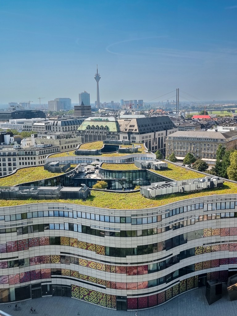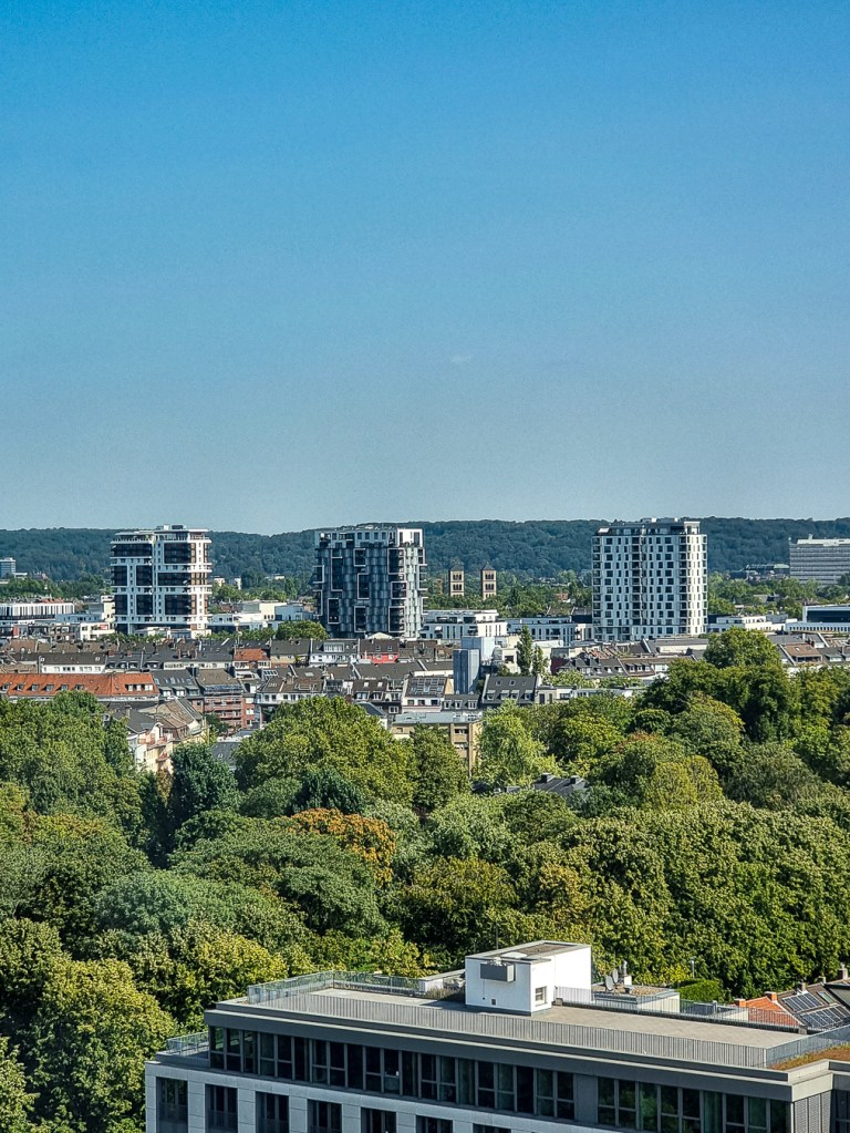 Ich bin wirklich beeindruckt, ich finde die Aussicht noch besser als vom Rheinturm, dem Fernsehturm Düsseldorfs, mit 240,5 Metern Höhe das höchste Bauwerk der Stadt. Und zwar deshalb, weil sich das Dreischeibenhaus an einem zentraleren Ort befindet, quasi mitten in der Stadt, so dass man in alle Richtungen einen guten Blick hat.