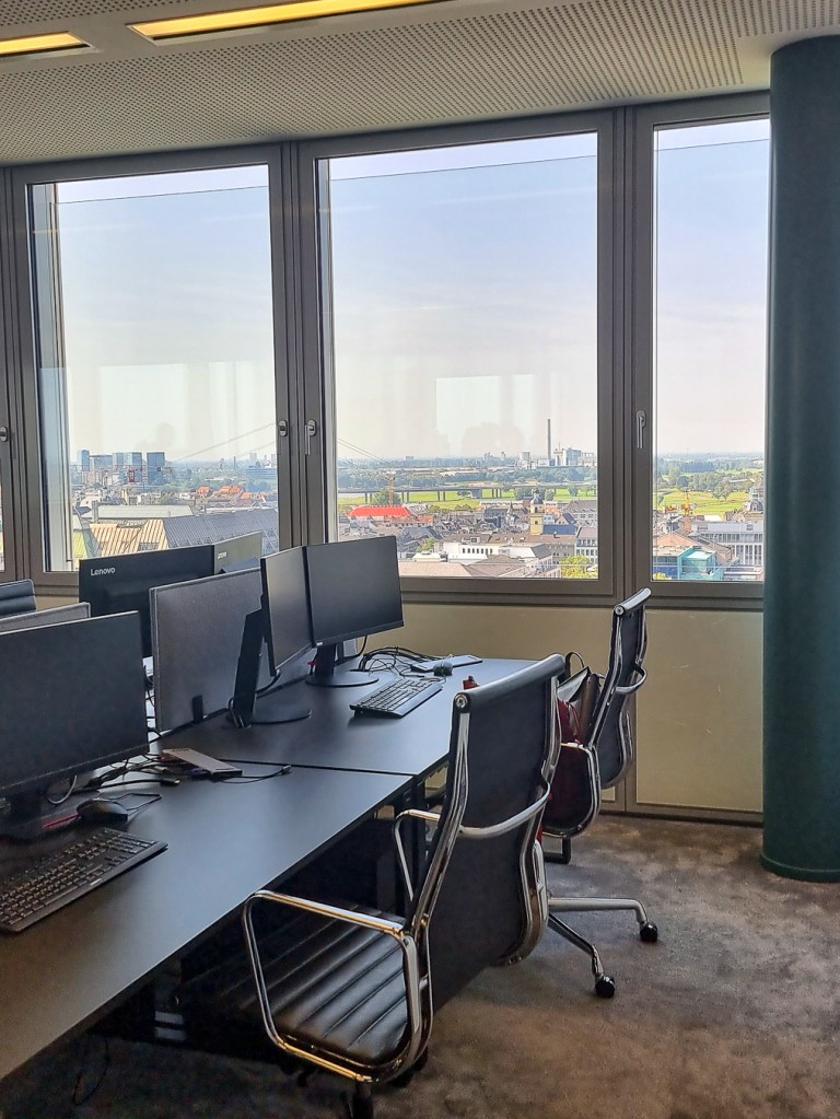 Der Guide fährt uns zunächst in den Keller, wo sich die Tiefgarage befindet. Er erklärt, dass das Dreischeibenhaus von der Tunnelstraße aus eine eigene Einfahrt hat. Spannender als den Keller finde ich persönlich den Einblick in eine der oberen Etagen, ich glaube, es war die 22. Etage.