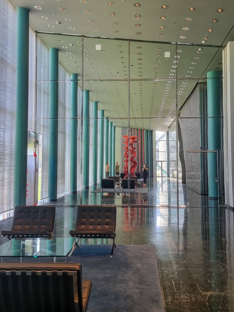 Im Jahr 2011 zog Thyssen in die neu errichtete Konzernzentrale („thyssenkrupp Quartier“) im Essener Westviertel und das Dreischeibenhaus wurde an die Momeni Projektentwicklung GmbH verkauft. Diese ließ es durch die ursprünglichen Architekten „revitalisieren“, wie uns der nette Guide bei der Führung erklärt. Die Lobby im Erdgeschoss ist bereits eine Augenweide… Hier ist alles noch genauso wie vor 63 Jahren. Leider habe ich den Namen des Künstlers der ins Auge stechenden Skulptur vergessen.