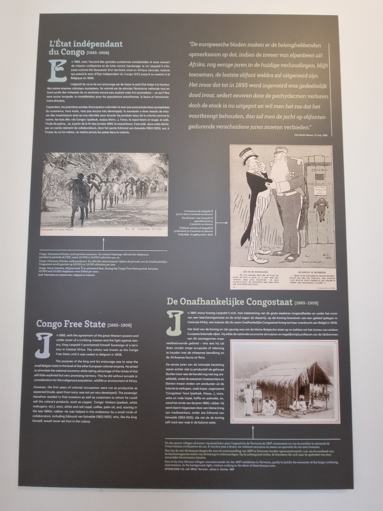 „Edmond van Eetveldes Sicht auf den Kongo war typisch für einen Mann seiner Zeit und seines Milieus“, lese ich (im Original auf Englisch) auf der Ausstellungstafel. „Ein weißer Mann aus einer bürgerlichen Elite, der überzeugt davon war, er würde wohltätige Arbeit leisten, wenn er die ‚Zivilisation‘ zu einem Volk brachte, das damals als minderwertig/unterlegen oder sogar primitiv angesehen wurde“.