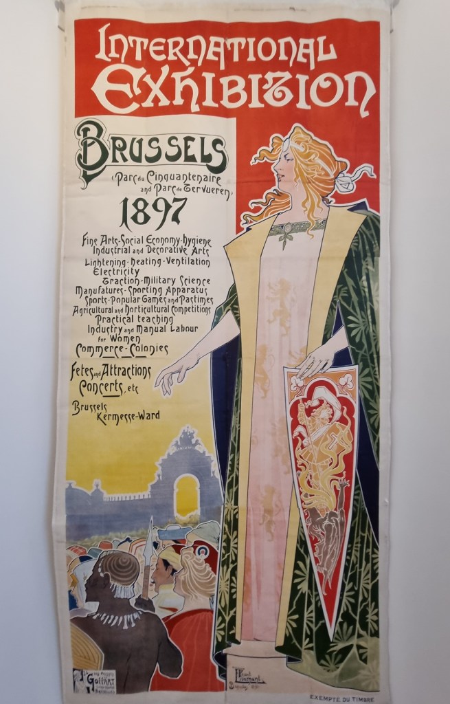 Doch zurück zum Jugendstil. Bei der Weltausstellung 1897 gab es zwei verschiedene Teile, einen im Jubelpark in Brüssel und dann noch eine separate Kongo-Ausstellung im Afrika-Palast in Tervuren. Dieses Gebäude wurde im Auftrag Leopolds II. eigens für die Ausstellung 1897 errichtet. Im Inneren entwarf Georges Hobé eine Jugendstil-Holzkonstruktion aus Tropenholz, um mit seinen geschwungenen Formen an die Üppigkeit des afrikanischen Waldes zu erinnern. „Die dort eingerichtete temporäre Ausstellung räumte neben den ‚Kuriositäten‘ des Kongo, ausgestopften Tieren und Objekten von ethnografischem Interesse, den Exportprodukten einen besonderen Platz ein: Kaffee, Kakao, Tabak und Waldarten“ (Wikipedia). Aus dieser Ausstellung ging schließlich das Museum des Kongo hervor, welches es heute noch gibt unter dem Namen „Königliches Museum für Zentralafrika“. Es wurde nach und nach modernisiert und inzwischen werden dort anscheinend auch die Kolonialverbrechen angesprochen.