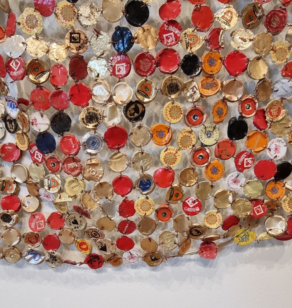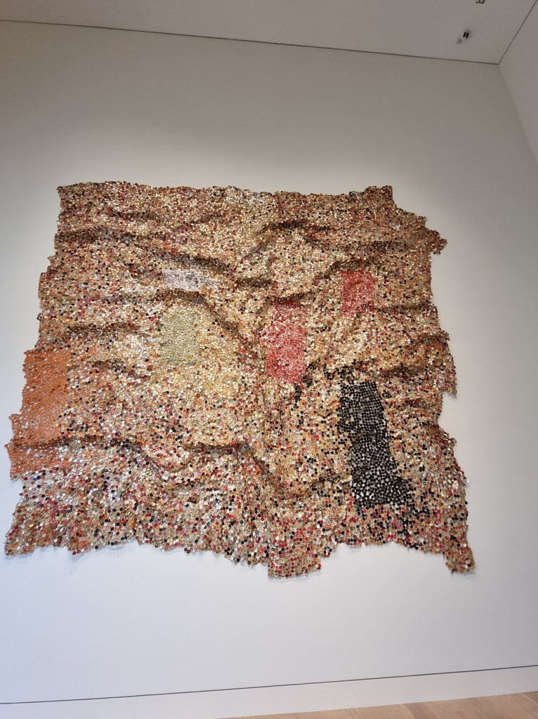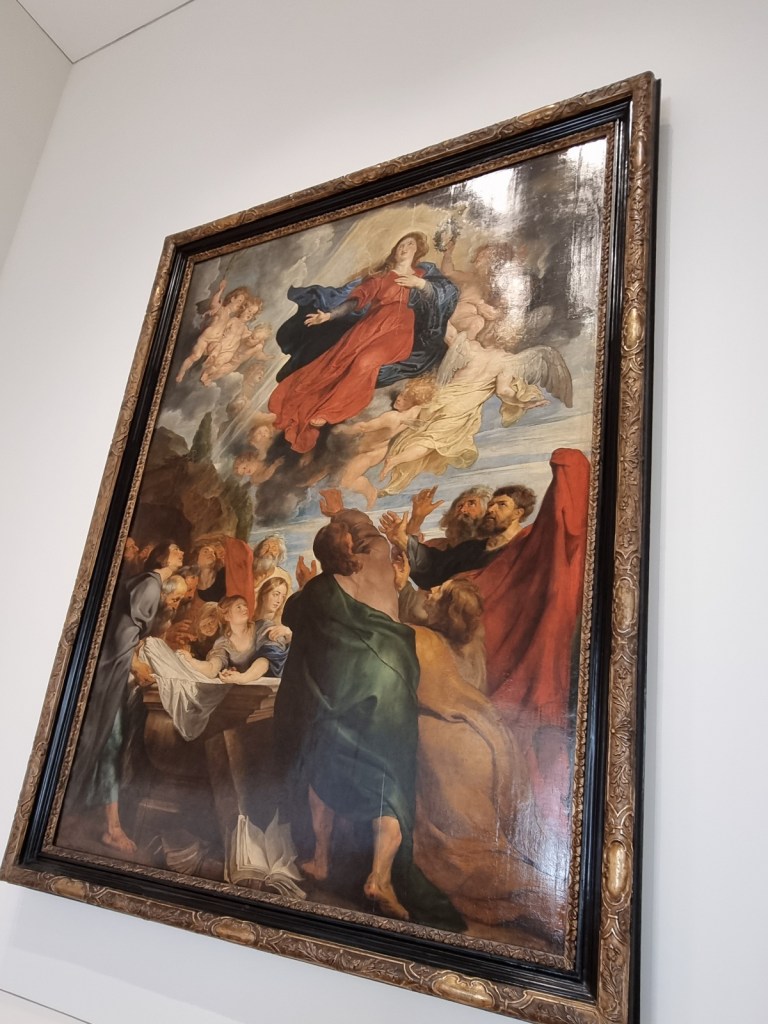 3. Für Menschen, die wie ich kürzlich das Thema „Kolonialismus“ entdeckt haben, gibt es einige sehr interessante Kunstwerke wie das imposante Werk „Erdtuch“ von El Anatsui (*1944) im Bronner-Saal. Es besteht aus lauter Aluminiumverschlüssen von Alkoholflaschen und „macht damit auf die Verstrickungen zwischen Afrika, Europa und Amerika aufmerksam“ (Text auf der Ausstellungstafel). Beim Sklavenhandel, den die damaligen Machthabenden betrieben, wurden die afrikanischen Beteiligten nämlich unter anderem mit Alkohol bezahlt. Ebenso erinnert es an die Umweltproblematik, an globalen Handel usw. In Verbindung mit dem gegenüberliegenden wunderschönen Peter-Paul-Rubens-Werk von der Himmelfahrt Mariens (aus genau der Zeit, in der die grausame Unterwerfung anderer Menschen zu Sklaven stattfand) tun sich – zumindest nach meinem Verständnis – Abgründe auf. Auch wenn es scheinbar eher Zufall ist, dass diese beiden Kunstwerke hier quasi miteinander hängen, denn nur der Bronner-Saal bietet laut Ausstellungstafel ausreichend Platz für sie. Auch einige andere Kunstwerke, wie das der jungen Künstlerin Talisa Lallai (*1989), die sich mit der westlichen Wahrnehmung des „Exotischen“ auseinandersetzt, finde ich unglaublich bereichernd. Ich habe es noch nie aus diesem Blickwinkel betrachtet.