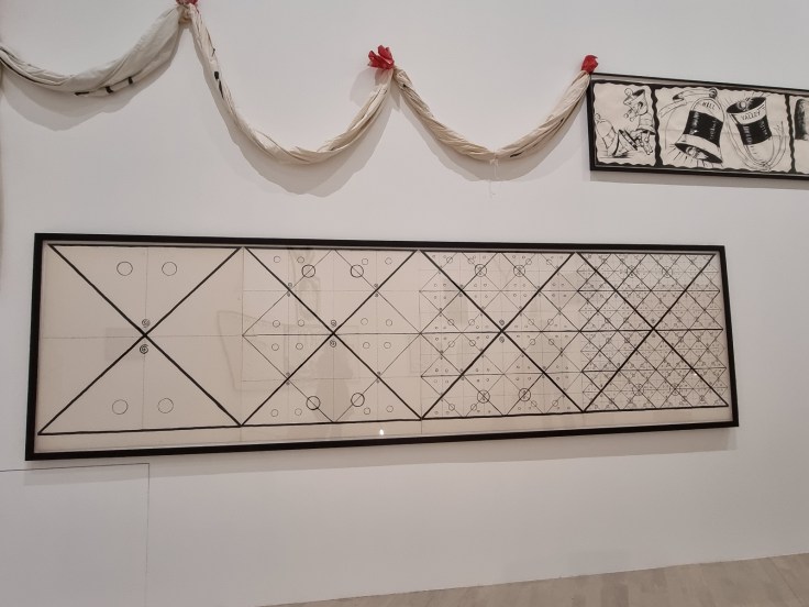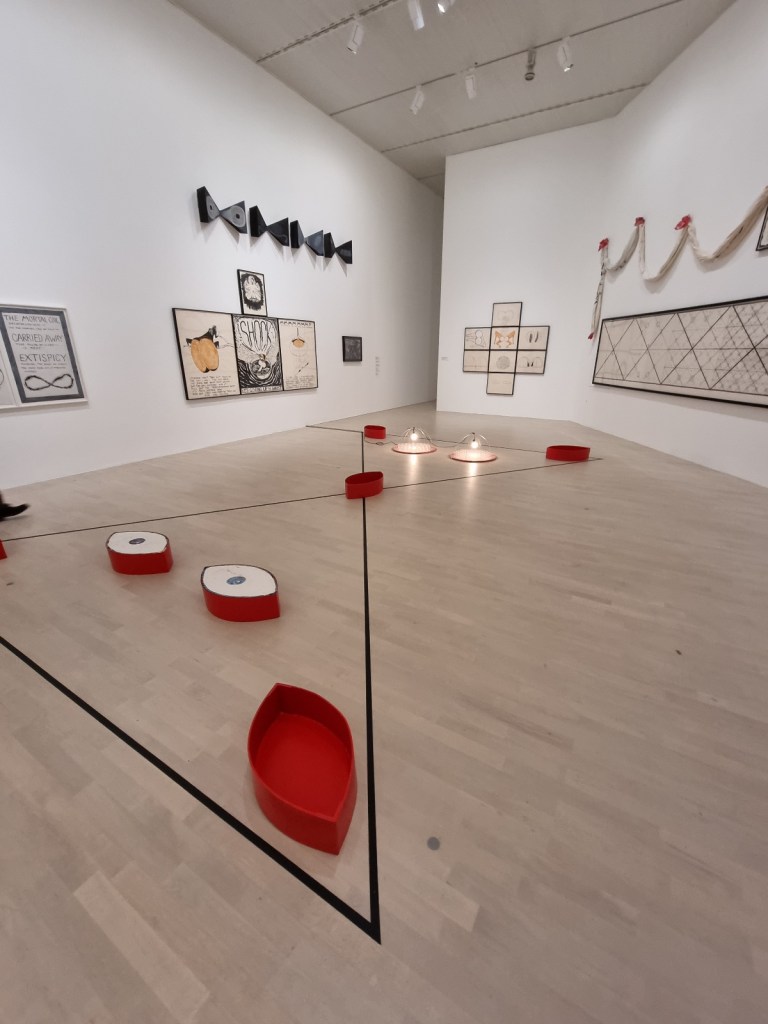Die Informationstafel der Ausstellung half uns, das Kunstwerk besser, also zumindest ein bisschen zu verstehen: Kelley erschuf ein Diagramm, das wie eine alternative Welterklärungsformel aussah. Mit all diesen Elementen (siehe Fotos) hinterfragte er den Anspruch der Wissenschaft auf Erklärungen und die Annahme, dass die Realität aus ewigen Strukturen besteht, die sich durch Sprache und Bilder entschlüsseln lassen. Wir mussten uns etwas anstrengen, all dies bei den Objekten im Raum nachzuvollziehen, doch man lernt ja gerne dazu.