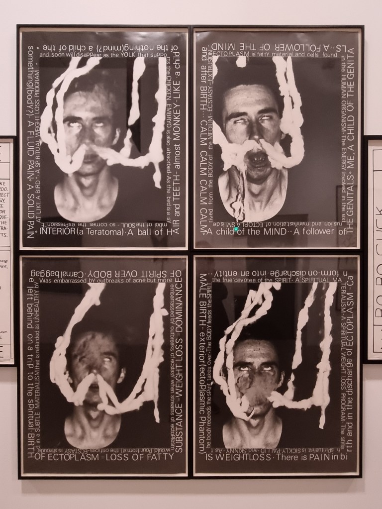 Die folgenden Ausstellungsexponate waren für uns etwas verständlicher. Der Künstler sah eine Parallele zwischen okkultistischen Ritualen und dem künstlerischen Schaffensprozess, da in beiden Fällen zuvor nicht existierende Dinge erschaffen und Ideen in physische Objekte transformiert werden. In seinen Foto-Text-Arbeiten inszenierte er sich als spiritistisches Medium, aus dem Ektoplasma hervorquillt – eine Substanz, die angeblich aus den Körperöffnungen eines Mediums austritt. Irgendwie auch zum Schmunzeln, diese Fotos und Überlegungen zum Poltergeist, oder?