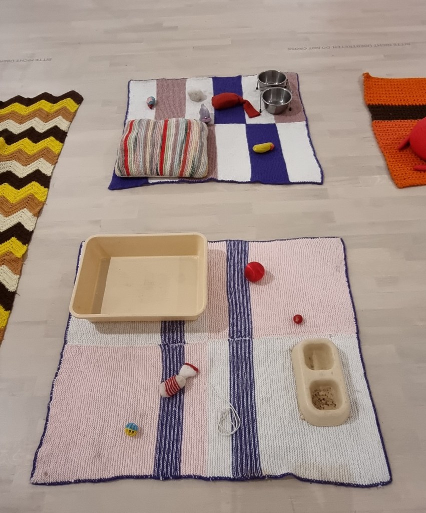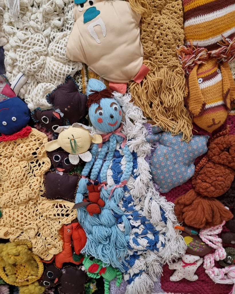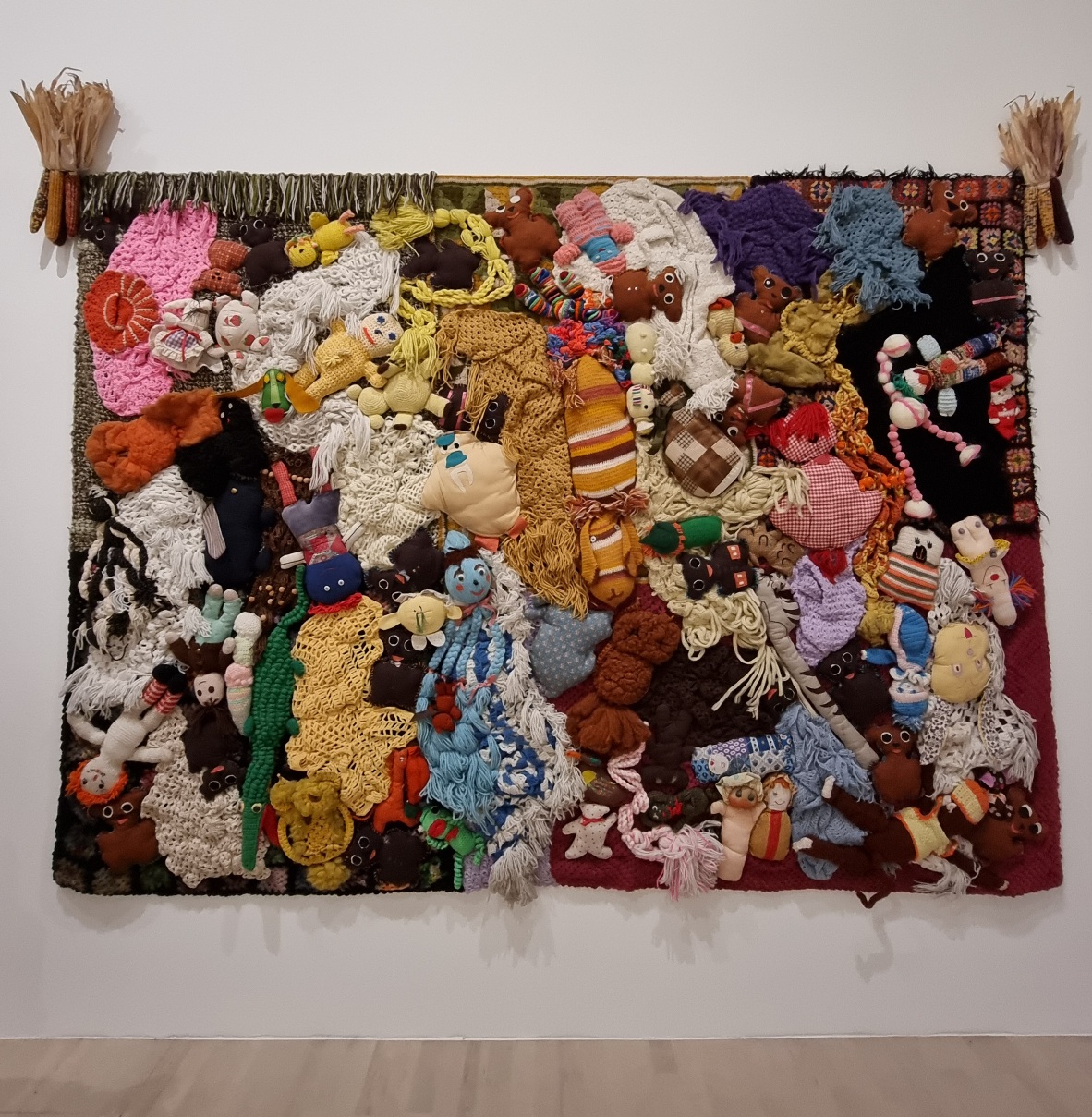 Der bunte „Teppich“ aus selbst gehäkelten Puppen, Decken und Tieren (die er auf Flohmärkten und bei Garagenverkäufen fand) ist eine wahre Augenweide und erscheint von weitem wie ein Gemälde. Der Titel „Mehr Liebesstunden, als jemals zurückgezahlt werden können“ weist auf die Machtverhältnisse innerhalb von Familien hin. Eltern, die Zeit aufwenden, um Dinge für ihre Kinder herzustellen, erwarten vielleicht unausgesprochen eine Gegenleistung vom Kind. „Aber nichts Materielles kann zurückgegeben werden, denn das Kind besitzt nichts. Was zurückgegeben werden muss, ist die Liebe selbst.“ (Ausstellungstext)