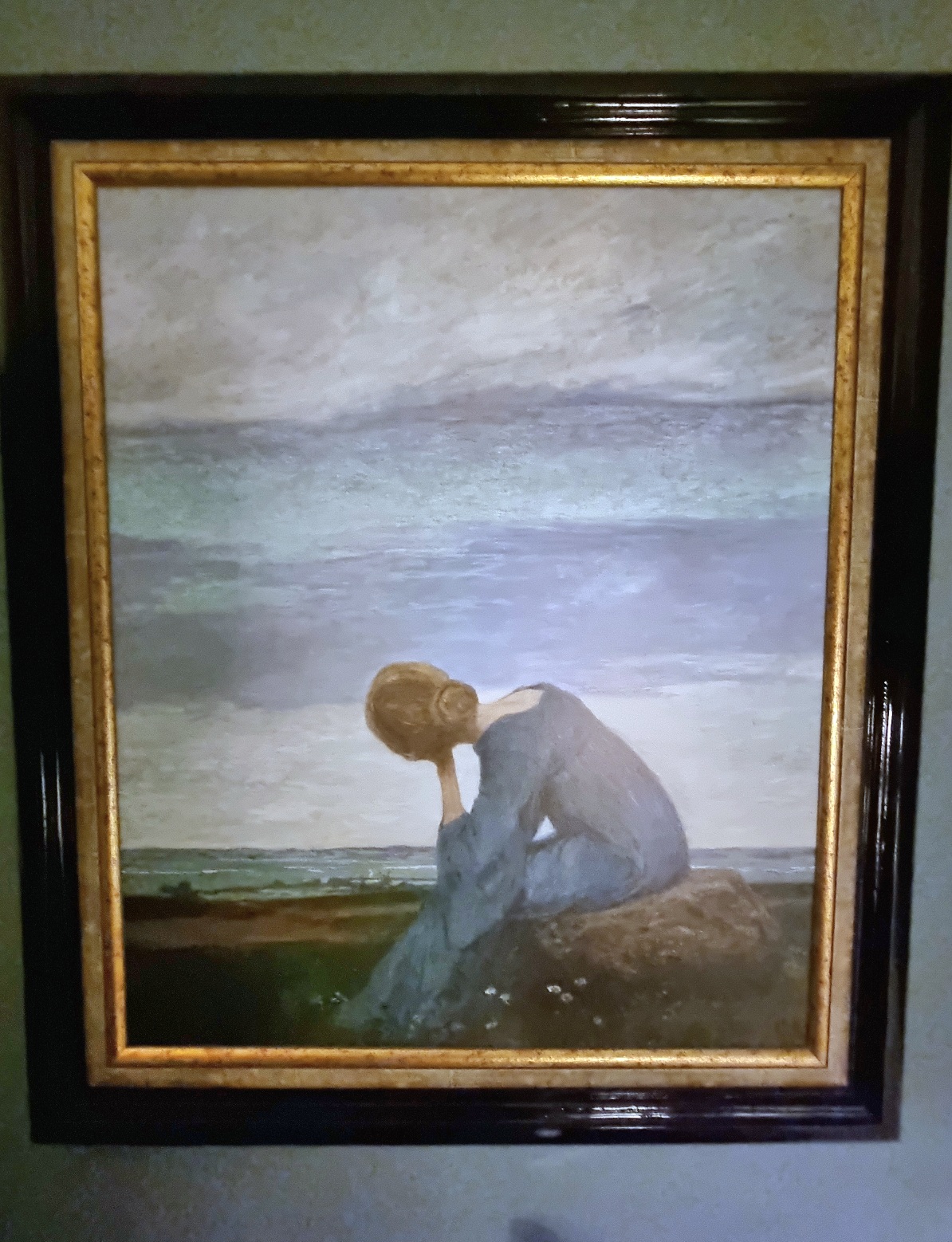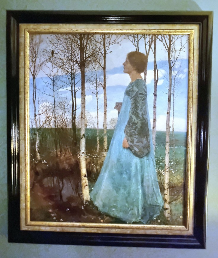 Im Hotel Village bekomme ich ein hübsches Zimmer, das sich über zwei Etagen erstreckt. Im unteren Teil befindet sich das Wohnzimmer, im oberen das Schlafzimmer. Als mein Blick auf die Wände fällt, bin ich entzückt. Sind das nicht Gemälde von Heinrich Vogeler, die hier hängen? Wohl kaum die Originale, aber dennoch müssen das Motive von Vogeler sein! Eine Frau im langen blauen Kleid, die in einem Birkenwald steht und versonnen einen Vogel im Baum betrachtet. Auf dem zweiten Bild eine Frau, die in die Ferne guckt – wir sehen nur ihr geknotetes blondes Haar und ihren Körper von hinten. Beide Bilder haben etwas Verträumtes, Unwirkliches und darüber hinaus Schönes, das mich ganz gefangen nimmt. So viel also von meinem Ankommen in Worpswede.