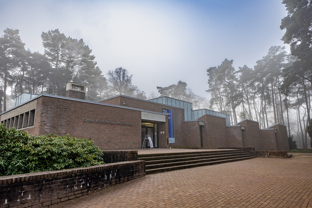 Es sind die Bäume. Die Bäume und der flache, in die Breite gezogene schlichte Backsteinbau aus den 1920ern, der äußerst gut zu ihnen passt. Dunkle, schlanke Kiefern erheben sich wie eine Armee um das Haus herum. Ihre langen dürren Stämme und bauschigen Kronen wanken im Wind. Nebel umhüllt die Welt dabei an diesem Tag wie ein transparentes Kleid und ich versinke ganz in diesem visuellen Eindruck. Was für eine verwunschene Stimmung… Ich ahne, wieso die Worpsweder Künstler hier aufschlugen. Hier bei den Kiefern kann ich es nachvollziehen.