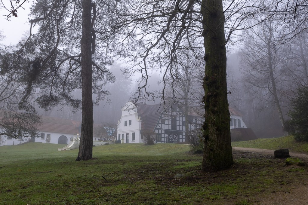 Das Haus ist mir von zahlreichen Abbildungen bekannt. Es ist ein spezielles Gebäude und hinterließ schon damals solch einen Eindruck bei mir, dass ich es seit dem ersten Entdecken in einem Buch unbedingt in echt sehen wollte. Auch dieses Haus liegt heute im Nebel und es ist umgeben von einem Wald, Teichen und einem Garten, der an die elegante Treppe mit dem Tor und den Empire-Urnen anschließt. Dahinter der geschwungene Biedermeier-Giebel. Ein wunderbares Fotomotiv: