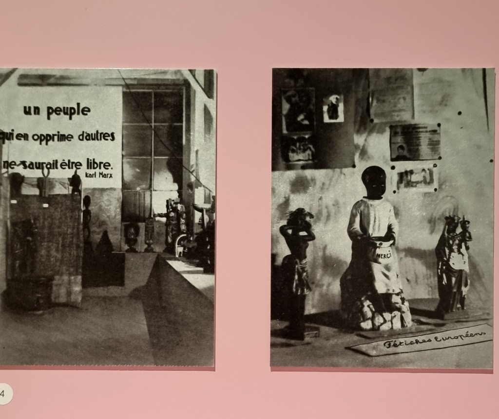In Paris fand im Jahr 1931 eine riesige sechsmonatige Kolonialausstellung statt, die die verschiedenen Kulturen und gewaltigen Ressourcen des französischen Kolonialreichs darstellen sollte. Es kamen sage und schreibe 8 bis 9 Millionen Menschen, um sich traditionelle Kunst, Hütten, Siedlungen und die Menschen aus den Kolonien selbst (Völkerschauen, das Thema hatte ich schon mal hier kurz behandelt) anzuschauen. Frankreich nutzte die Ausstellung, um politisch zu vermitteln, dass sein Kolonialreich ein humanitäres Projekt sei. Es betonte den kulturellen Austausch und die Vorteile, die Frankreich für seine Überseeterritorien gebracht habe und verschwieg Gewalt und Zwangsarbeit. In der Ausstellung kann man einen Aufruf von Surrealisten betrachten, nicht in die Ausstellung zu gehen (siehe Foto). Dort wird die erzwungene Arbeit erwähnt und gesagt, dass man „diese Menschen, die nicht so „entartet“ sind wie wir…“, „vielleicht für so gut unterrichtet über die wahren Ziele der Menschheit, über Wissen, Liebe und Glück des Menschen halten darf, wie wir es nicht mehr sind…“