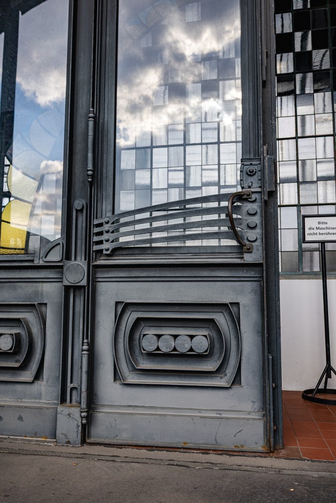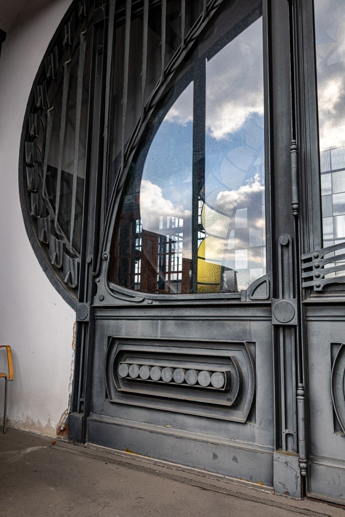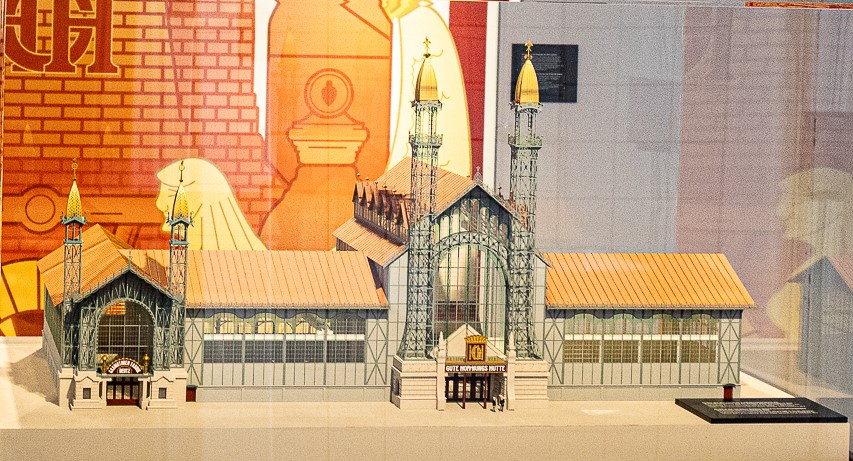 Die Industrie- und Gewerbeausstellung in Düsseldorf im Jahr 1902 spielte eine entscheidende Rolle dabei, dass wir heute dieses wunderschöne und einzigartige Jugendstil-Portal bestaunen können. Denn dort wurde ein spektakulärer Ausstellungspavillon der Gutehoffnungshütte (GHH, Oberhausen) aus Stahl und Glas gezeigt – damals das Modernste vom Modernen. Die Gelsenkirchener Bergwerks-AG (GBAG) ließ sich dadurch inspirieren und schuf mit Hilfe des hinzugezogenen Architekten Bruno Möhring (1863-1924) anstelle eines Massivbaus eine Eisenfachwerk-Konstruktion mit dazugehörigem Jugendstil-Dekor (ähnlich dem Pavillon der GHH). Ein Modell davon kann man vor Ort betrachten (siehe Foto). Der Hauptteil wurde übrigens damals nach Mexiko verschifft und steht dort immer noch als Museo Universiatario del Chopo.