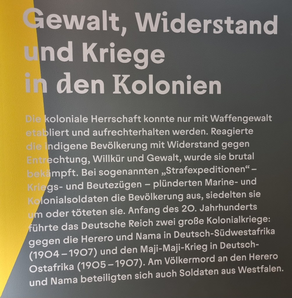 Die Ausstellung des Landschaftverbands Westfalen-Lippe in Dortmund beleuchtet vor allem die Berührungspunkte des NRW-Landesteils Westfalen mit dem Kolonialismus. Zahlreiche konkrete Beispiele, sowohl von Firmen als auch von Personen, die als Unternehmer, Missionare oder Farmer in den Kolonien tätig waren, werden vorgestellt. Zudem werden die bis in die heutige Gegenwart reichenden Folgen beschrieben. Jede Besucherin und jeder Besucher der Ausstellung kann sich die Frage stellen: Was hat das mit mir zu tun?