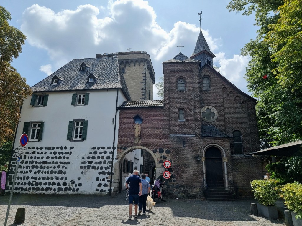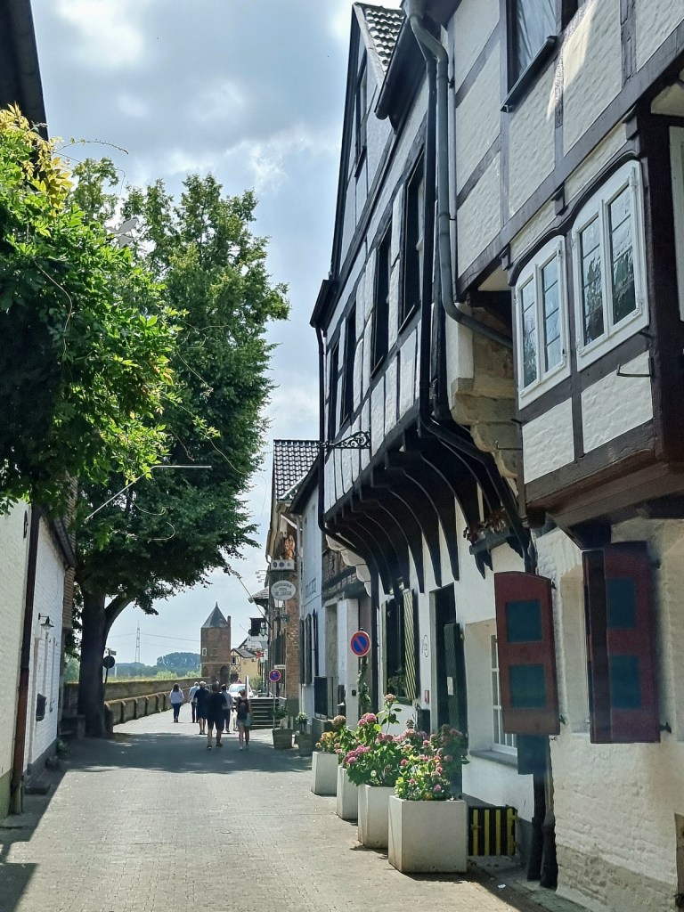 Wenn man sich dann schon mal in Zons befindet, schaut man sich natürlich auch noch die sehenswerte mittelalterliche Stadt an. Tatsächlich würde ich das Wort „Stadt“ nicht benutzen, sondern eher „Ortschaft“, aber mit ihren 5.500 Einwohnerinnen und Einwohnern ist Zons seit dem Mittelalter wirklich eine Stadt. Man kann sich dort allerlei angucken: Das Rheintor, die Burg Friedestrom, den Krötschenturm, die Windmühle, die Stadtmauer, die vielen kleinen Souvenir-Geschäfte und Cafés und am Ende kann man dann noch in den Rheinauen einen Spaziergang zur Entspannung machen… Also auf nach Zons!