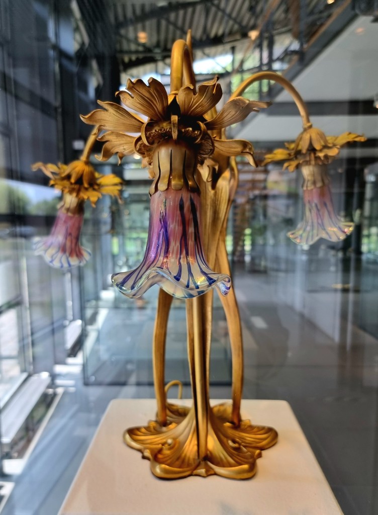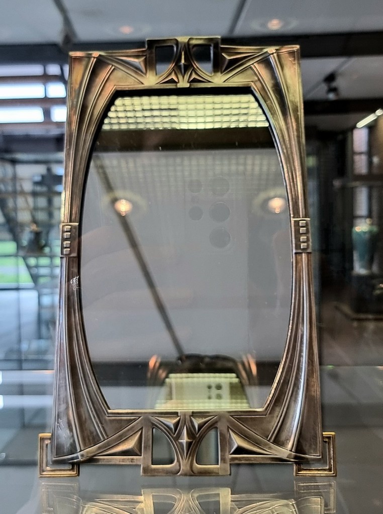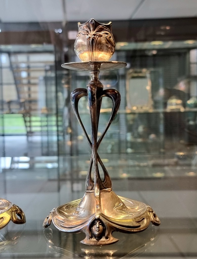 Zinngegenstände kenne ich selbst nur noch sporadisch aus den Wohnungseinrichtungen der Großeltern oder Eltern in meiner Kindheit. In meiner eigenen Generation hatten die allermeisten kein Interesse mehr an dem Material. Anscheinend war das um das Jahr 1900 herum jedoch gänzlich anders. Das glänzende „Silber des kleinen Mannes“ erfreute sich großer Beliebtheit im Bürgertum. Man benutzte es für Gebrauchsgegenstände wie Gläser oder Teekannen oder für elegante „Deko-Artikel“ wie Kerzenständer, Vasen oder Visitenkartenschalen. Natürlich machte die damalige Mode der Jugendstil-Formen mit ihren geschwungenen floralen Linien oder anderen Anleihen aus der Natur nicht vor diesen Gegenständen Halt. Und so können wir in der Ausstellung allerlei schöne Werke betrachten… die in dem modernen, von großen Glasflächen geprägten Anbau übrigens sehr gut zur Geltung kommen!