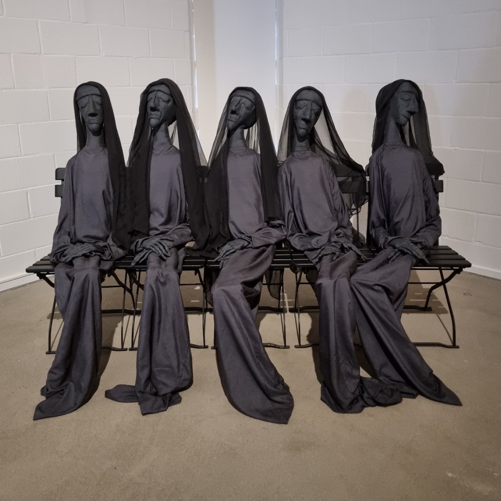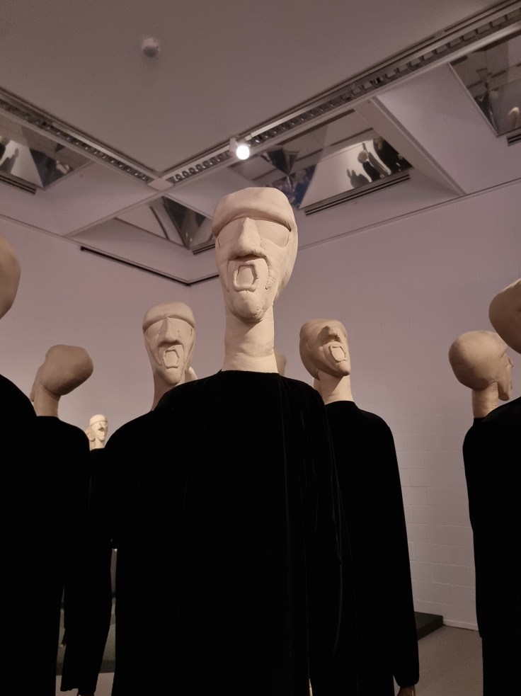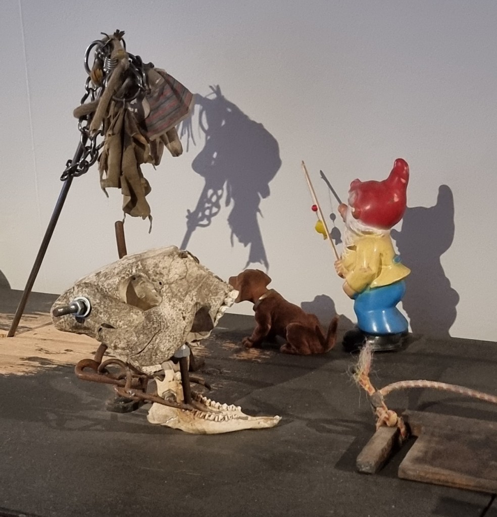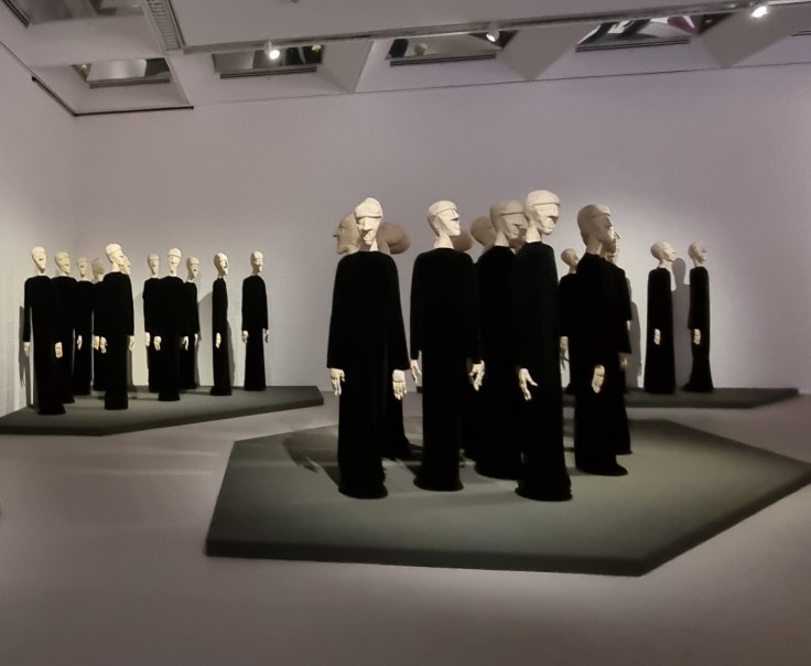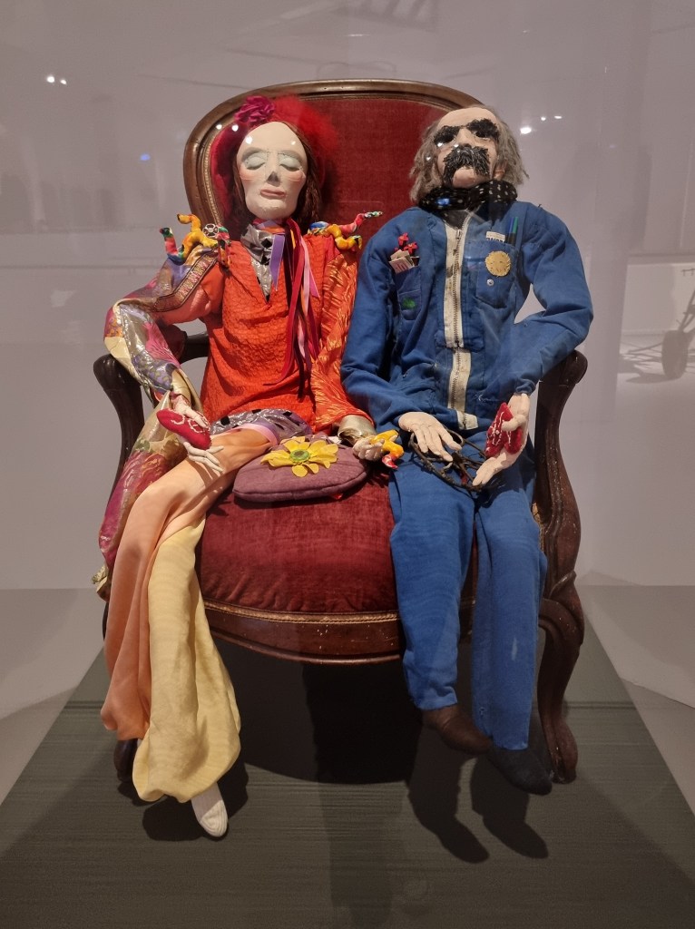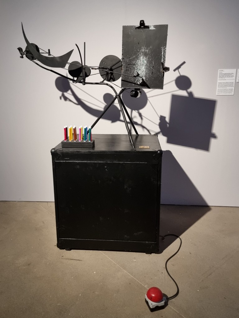 Eva Aeppli hingegen zeichnet sich durch ihre handgenähten Figuren aus, teils in beeindruckender Größe. Aus den Augenwinkeln kann man schon mal eine Gruppe Menschen mit ihren Puppen verwechseln und wenn man dann in die Gesichter der Puppen blickt, wird man mit einer Vielzahl von menschlichen Gesichtsausdrücken und Seelenzuständen konfrontiert. Oft spielt der Tod eine Rolle in ihrem Werk und man spürt bei ganz vielen Arbeiten: Da hat sich jemand auseinandergesetzt mit den Gräueln zu Beginn des 20. Jahrhunderts. Trotz allen Ernstes kommt bei beiden immer wieder schwarzer Humor und Ironie zum Vorschein (Nur bei der Malmaschine „Meta-Matic No. 10“ blieb mir persönlich das Lachen im Halse stecken. Ursprünglich gedacht als ironische Antwort auf die abstrakte Kunst der Nachkriegsjahre, ist die Abnahme von kreativer Arbeit durch eine Maschine ja inzwischen tatsächlich Möglichkeit und Wirklichkeit geworden).