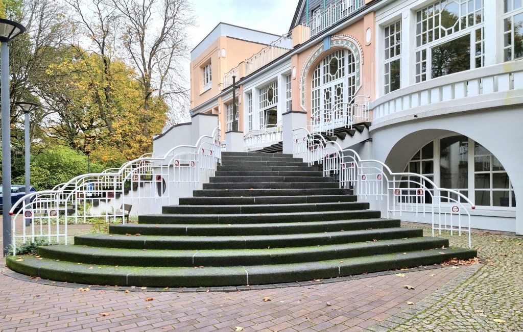 Was für eine beeindruckende Freitreppe! Und die vielen tollen Sprossenfenster… Vor allem aber die Ornamente drumherum! Das muss doch Jugendstil sein!