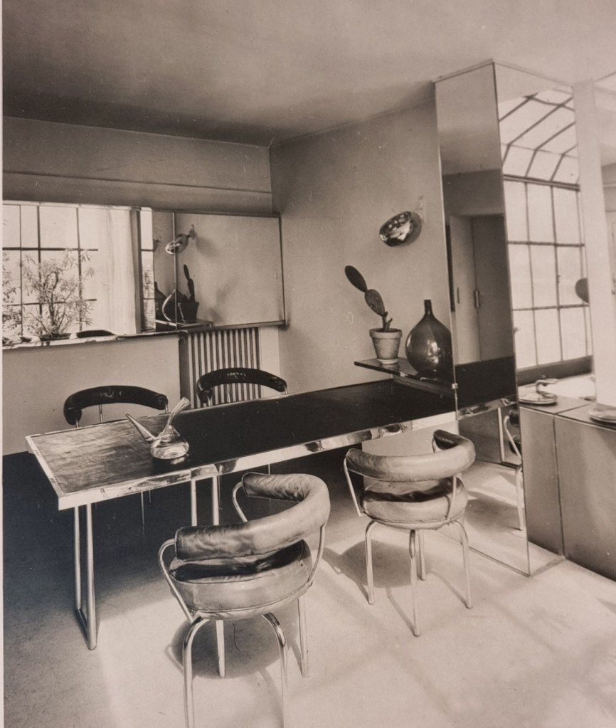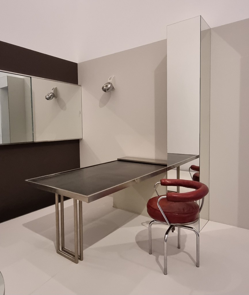 Dass wir dann wieder einmal in falscher Reihenfolge durch die Ausstellungsräume liefen – geschenkt. Schon die Nachbildung von Charlotte Perriands eigener kleiner Dachgeschosswohnung in Paris von 1927 mit einem ausziehbaren Tisch aus Stahlrohrbeinen begeisterte ihn, vor allem die Technik, die den ausziehbaren Teil auf ominöse Weise in der Wand verschwinden ließ.