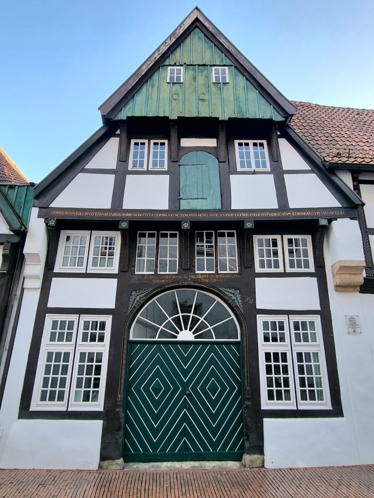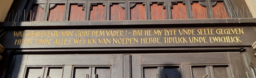 Meine liebe Nachbarin fiel mir spontan ein, als ich Schwierigkeiten hatte, ihn zu entschlüsseln. „Geloevestu“ übersetzte ich mit „Gelobst“, was aber irgendwie nicht zum restlichen Text passte. Da muss ein Profi ran, der des Plattdeutschen mächtig ist, dachte ich und schrieb sie an. Es kam ihr gleich komisch vor und mit guter Spürnase fand sie heraus, dass es eben kein plattdeutscher Text ist, sondern ein mittelniederdeutscher. Er stammt aus einem Katechismus von 1539. Alle älteren Protestantinnen und Protestanten erinnern sich vielleicht an die Fragen und Antworten, die sie im Konfirmandenunterricht alle auswendig lernen mussten. Unser Pastor hat sie damals jedenfalls sehr streng abgefragt. Der Spruch lautet also übersetzt: „Was glaubst du von Gott, dem Vater? Dass er mir Leib und Seele gegeben hat und alles, was ich nötig habe, zeitlich und ewiglich.“