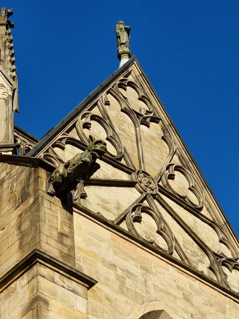Die Strebepfeiler (pfeilartige Mauerverdickung) sind wohl typisch gotisch und besitzen an ihrem oberen Ende Wasserspeier, die nicht nur eine dekorative, sondern auch eine praktische Funktion als wasserabführendes Rohr hatten.