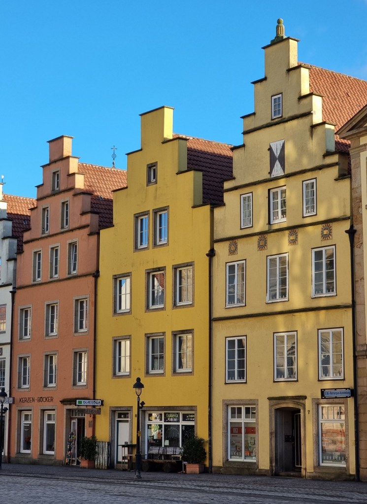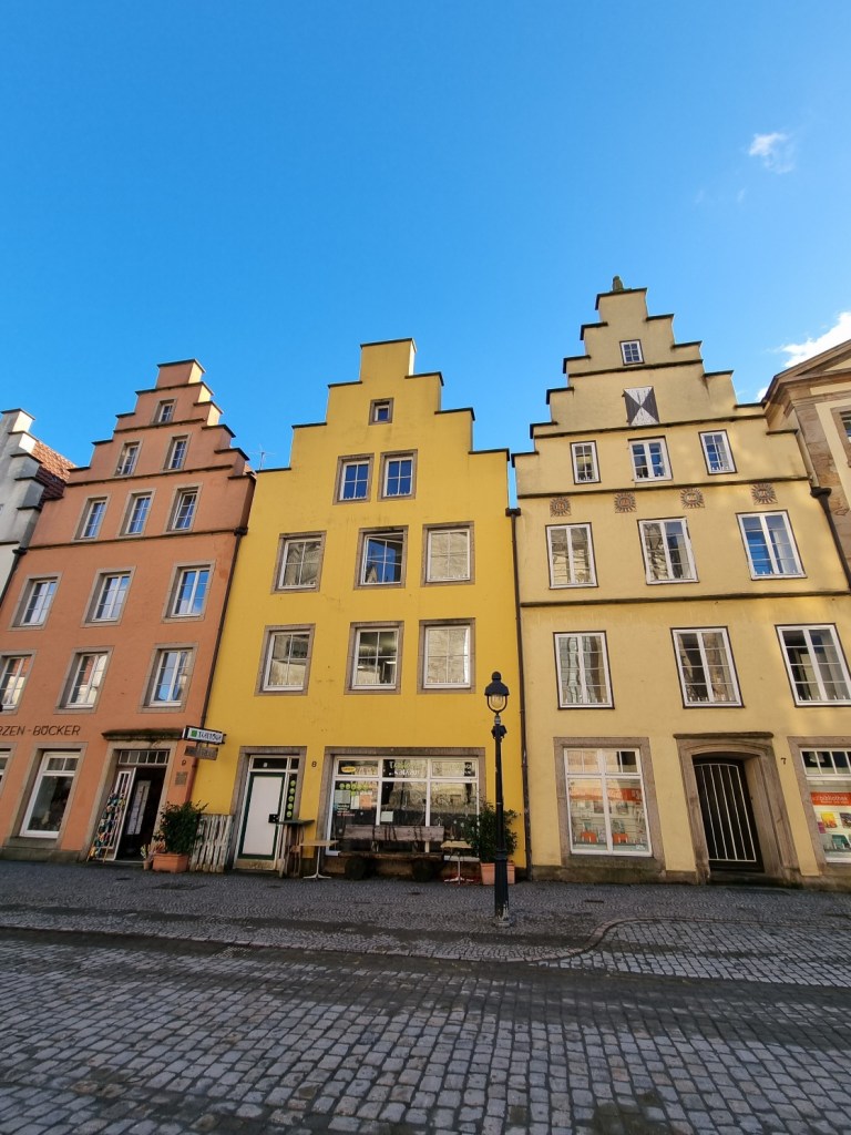 Nachdem ich das Theater besichtigt hatte, bin ich immer der Nase nach durch die Straßen gelaufen. Besonders schön fand ich den Markt(platz) mit dem historischen Rathaus, in dem einer der beiden Verträge zum Westfälischen Frieden unterzeichnet wurde (zur Erinnerung: Diese Dokumente beendeten den Dreißigjährigen Krieg von 1618-1648). Die bunten Giebelhäuser des Marktplatzes, der heute nicht mehr als solcher genutzt wird, schienen an diesem Tag zu strahlen und auch die spätgotische Kirche St. Marien wurde von der Sonne in ein schönes Licht getaucht.